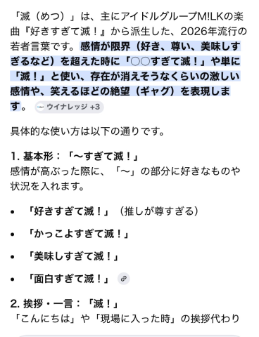 皆様こんにちは先日ローソンで待ちに待ったパンとエスプレッソとのコラボ商品「しっとりフレンチトースト」を1年ぶりに食べてその美味しさに改めて感動しその後ローソンで見付ける度狂った様にリピ買いをしては職場の朝ごはんで楽しんでいるフレンチトーストが好きすぎて滅ともみですwところでアイドルグループM!LKの大ヒット曲「好きすぎて滅!」を知ってはいるものの昔からジャニーズやアイドルに疎い私は「滅!」の意味を知ろうともせず今日を迎えて日記を書いた次第なんですが滅!にはこんな意味や使い方があるんですねさすがに挨拶代わりに滅!はマズいですが私のしっとりフレンチトースト愛は止まる事を知らずぜーーんぶひっくるめて滅!ですw因みににもぐナビの中評価はある意味「滅!」ですw皆様もご興味ございましたらしっとりフレンチトーストを是非食べて頂き私と一緒に感動の「滅!」しましょうwではでは本日もありがとうございましたともみとはまた明日お会いしましょうお疲れ様でした