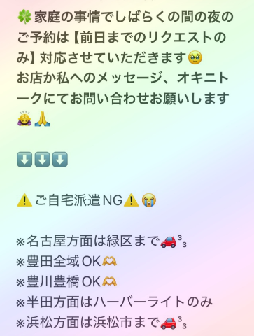 おはようございます  昨日の初めまして様 ありがとうございました! 普段書かないけど 少し書かせて。 〇回はぴっくりしたわ!  まさに何も出ないまで スッキリで良かったです  またお呼び出しお待ちしてます     今日も短い時間ですので 三河安城に行くべきか迷う  たぶん安城にいるけど。 スタートご検討の 東三河の方は 8:30くらいまでに 仮予約でもポチしてくれたら そちらに向かいますゆえ 確実に行けます  ところで岡崎は東三河?? ん???  昨日スーツ着た方をたくさん見た。 そうだ!入社式  自分くらいの歳になると 移動か〜 新年度か〜の感覚しかなかった  いつか流行った退職代〇も 消え失せたし 辞める時は辞めると 伝えられる大人になりなさいよ、と 見送った私はもうお局。 新年度はバタバタしますが ふと空いたらぜひお待ちしております  今日も良い一日を お過ごしくださいませ