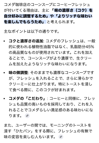 皆様おはようございます先日久しぶりにコメダ珈琲店のおひとり様モーニングで初めてドリンクにコーンスープをオーダーしサービスのトーストとゆで卵を食べて至福の時を味わったコメダのトーストは毎回バターたっぷりに絶対に変更しちゃうともみですwところでSNSなどでよく見かける「コメダモーニング裏ワザ」をついつい覗いちゃうんですが今まで知らなかったコメダモーニングの新常識が知れてまさに目から鱗なんです私がよく使うバターたっぷりもSNSで入手した裏ワザなんですがパンの「よく焼き」や「バター別添え」も出来るんですねホイップ追加で小倉トーストが楽しめるなんて是非やってみたいですところで今回1番謎だったのがコーンスープにコーヒー等に添付されるフレッシュが付いてきた事なんです調べてみたらコメダのフレッシュは脂肪分45%の高品質な物が使われていたんですね私はてっきり昔からある植物性のフレッシュだと思い込んでいましたので使わなかった事を今更大後悔していますw次回こそはコーンスープにフレッシュをたっぷり入れて生クリームの様なコクを楽んで皆様に「ともみのおひとり様コメダモーニングコーンスープにフレッシュ入れたよレポ」をお伝えしようと思いますw皆様はコメダモーニングの裏ワザや使われているフレッシュが実は脂肪分45%の高品質という事はご存知でしたか?まだまだ私はコメダ猛者と言われるには程遠いようですwではではまた日記更新しますのでお楽しみに女の子ページへ http://365diary.net/cTR4R0xnL3Qvenl1a3VfYmltYXp5by82MjczMjQ0OQ--美魔女コレクションはコチラ