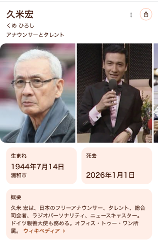 皆様こんにちは昨夜フリーアナウンサー久米宏さんの訃報を知りとてもショックを受けたともみです幼少期には久米宏さんと黒柳徹子さん司会の生放送歌番組「ザ・ベストテン」を見ていましたし毎週金曜日を楽しみにしていましたWikipediaで確認したら当時すでに久米宏さんはTBSを退社してフリーアナウンサーになっていたんですねしかもよりにもよって今年の元旦に亡くなられたんですね亨年81歳の久米宏さんは失礼ながら私の父親でもおかしくないぐらいのご年齢だなとシンプルに感じちゃいましたが皆様の久米宏さんの思い出番組はございますか?記憶に新しいのはやはり報道ステーションですかねではでは今日の日記はここまでお疲れ様でした女の子ページへ http://365diary.net/N0drM2xpL3Qvenl1a3VfYmltYXp5by82MjczMjQ0OQ--美魔女コレクションはコチラ