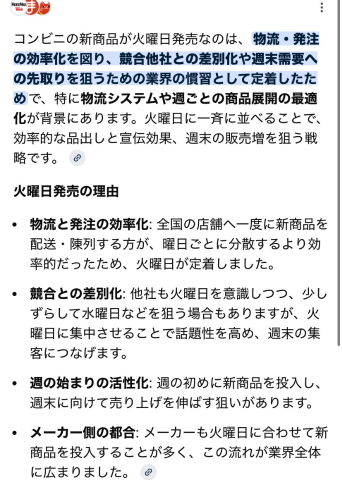 皆様こんにちは美魔女出勤する前にローソンの新発売スィーツ「ドゥーブルショコラ」を食べて束の間のおやつタイムを楽しんだともみですSNSなどでコンビニスィーツの新発売情報をいち早くキャッチして流して下さるユーザーさんのお陰でドゥーブルショコラを知り食べる楽しみが出来ましたし色んなスィーツも知る事が出来るのでSNSはとても有り難いですねしかし大体のコンビニチェーンは何故毎週火曜日に新商品を発売するのかずっと謎でしたがこういう理由があるんですね!今の世の中はパソコンやスマホで調べれば直ぐにGoogleAI先生やチャッピー(チャットGPT)が色々な事情を教えてくれるので本当に便利ですし益々目から鱗です皆様はSNSで色んな新発売情報などをキャッチされますかローソンのドゥーブルショコラもオススメなので是非食べてみてくださいねではでは本日の日記はここまでお疲れ様でした女の子ページへ http://365diary.net/akw5bHRiL3Qvenl1a3VfYmltYXp5by82MjczMjQ0OQ--美魔女コレクションはコチラ